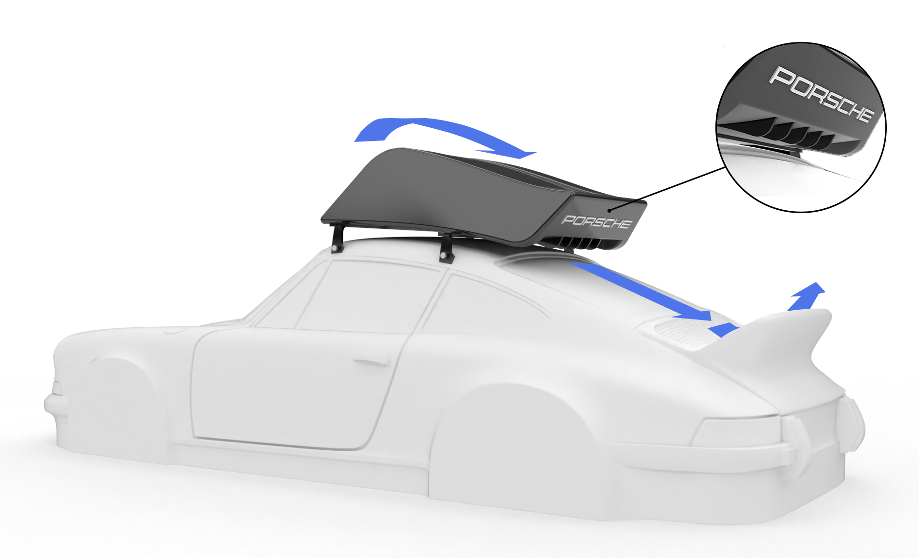Conventional roof boxes compromise airflow, especially on air-cooled vehicles. Aero rethinks rooftop storage with an aerodynamic form that optimizes engine cooling on the Porsche 911.
